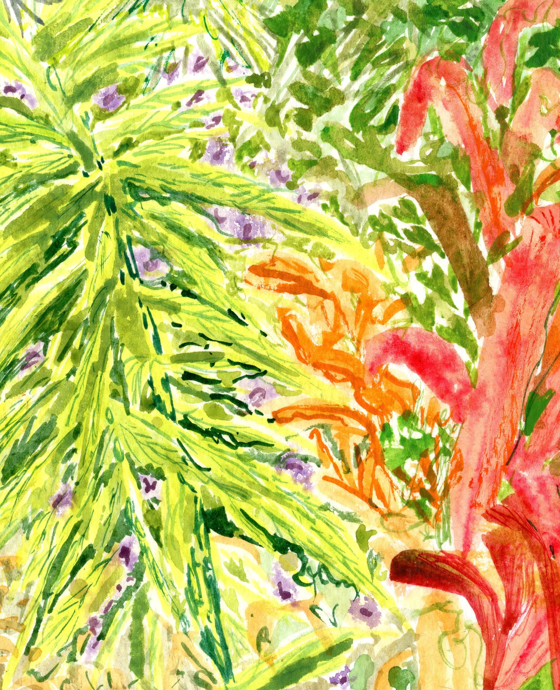 Print of my original watercolor painting of juicy bromeliads among jungle vines. Bromeliad leaves aren’t a food crop, but they sure are a feast for the eyes. Pineapples grow from the center of bromeliads, and geckos love to hide inside the center. There's always some delight among these plants.